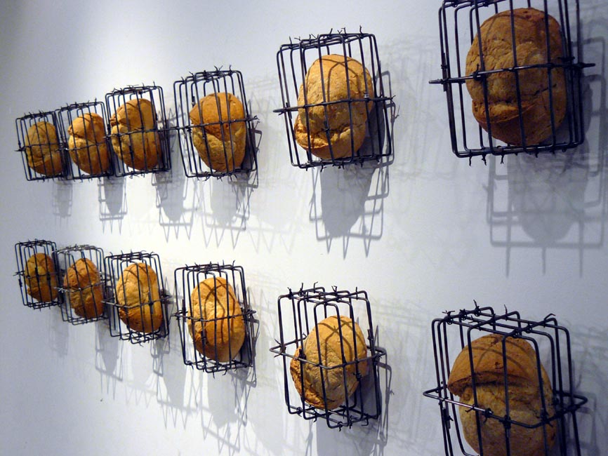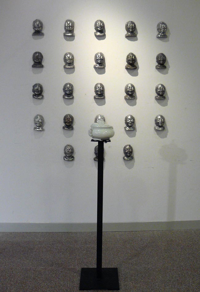 La instal·lació està composada per 20/25 caps, reproduccions en plom d’una guardiola usada a les escoles per recaptar diners per “ajudar” Àfrica. Davant hi ha una sopera luxosa… buida