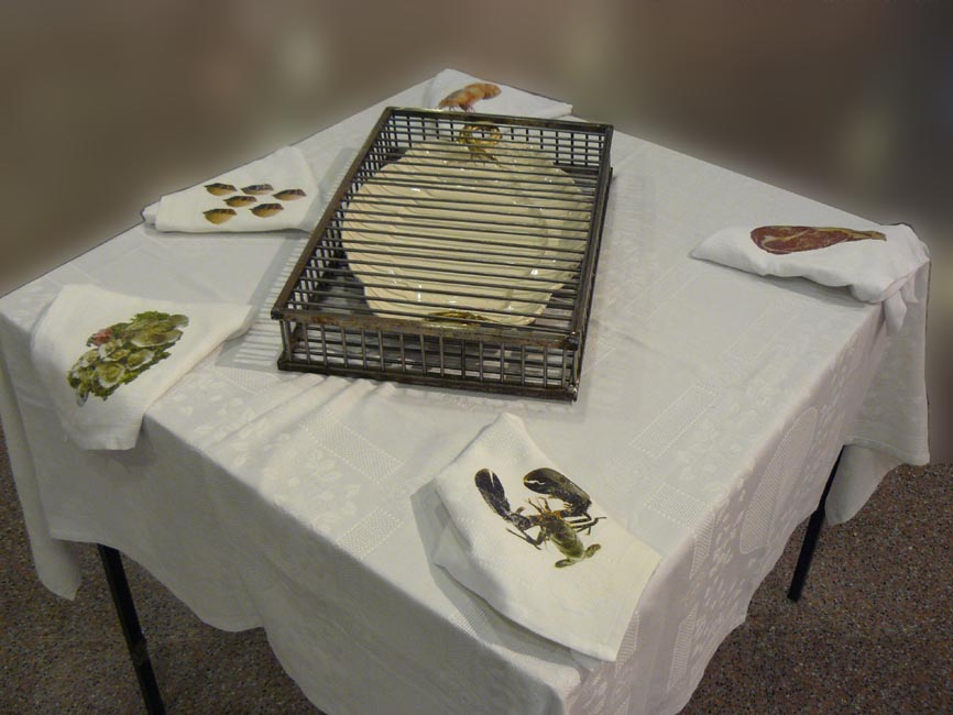 Tancada dins una gàbia una safata amb nances daurades presideix una taula on les menges luxoses són només estampats en tovallons.