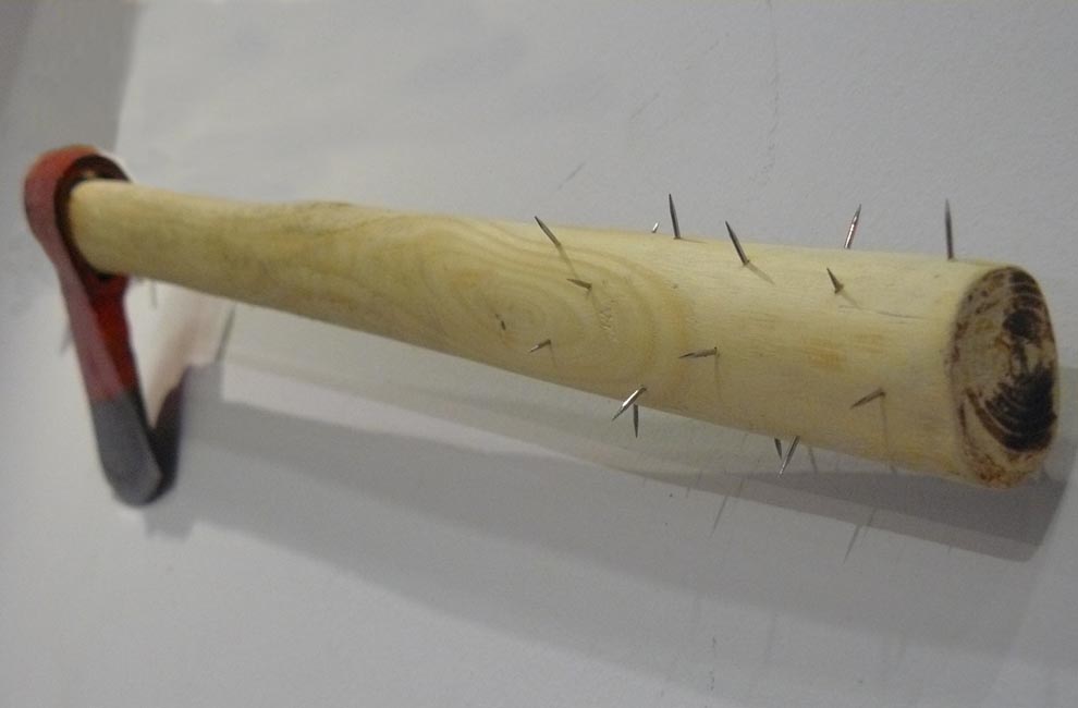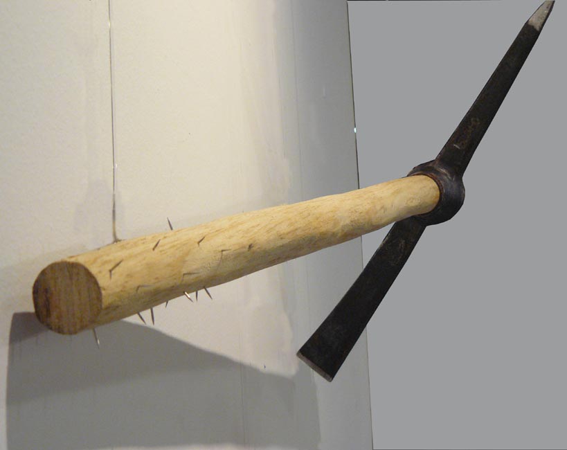 Un pic i una destral amb el mànec intervingut amb agulles de gramòfon.